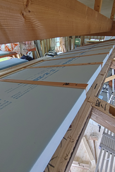 国産桧を使用した太い躯体がベースとなります。床、壁、天井には気密性の高い断熱材を使っている為、高気密高断熱。空気の通り道もあり湿気に強いです。しかもFjimondのミニハウス,Tomteでは透湿防水シート、改良アスファルトルーフィングを使用しています。日本住宅の95%が非透湿を使用してる中、見えない所にも手を抜きません。これを使用する事によって断熱材や構造材、外壁下地材、外壁材が長持ちします。