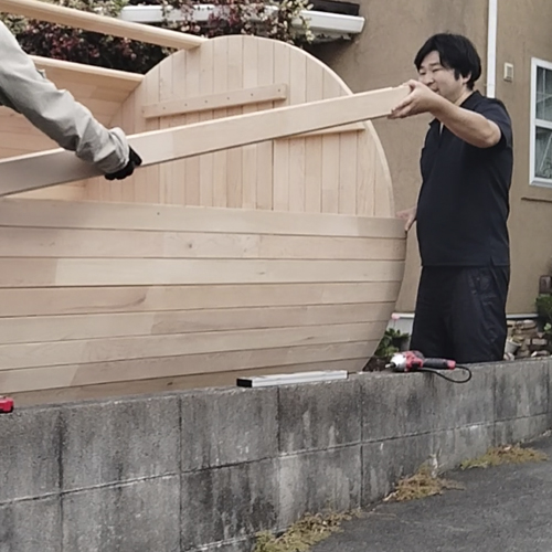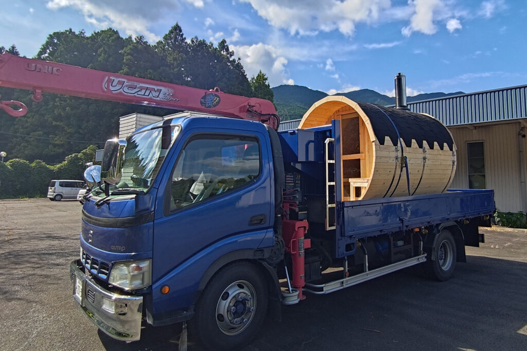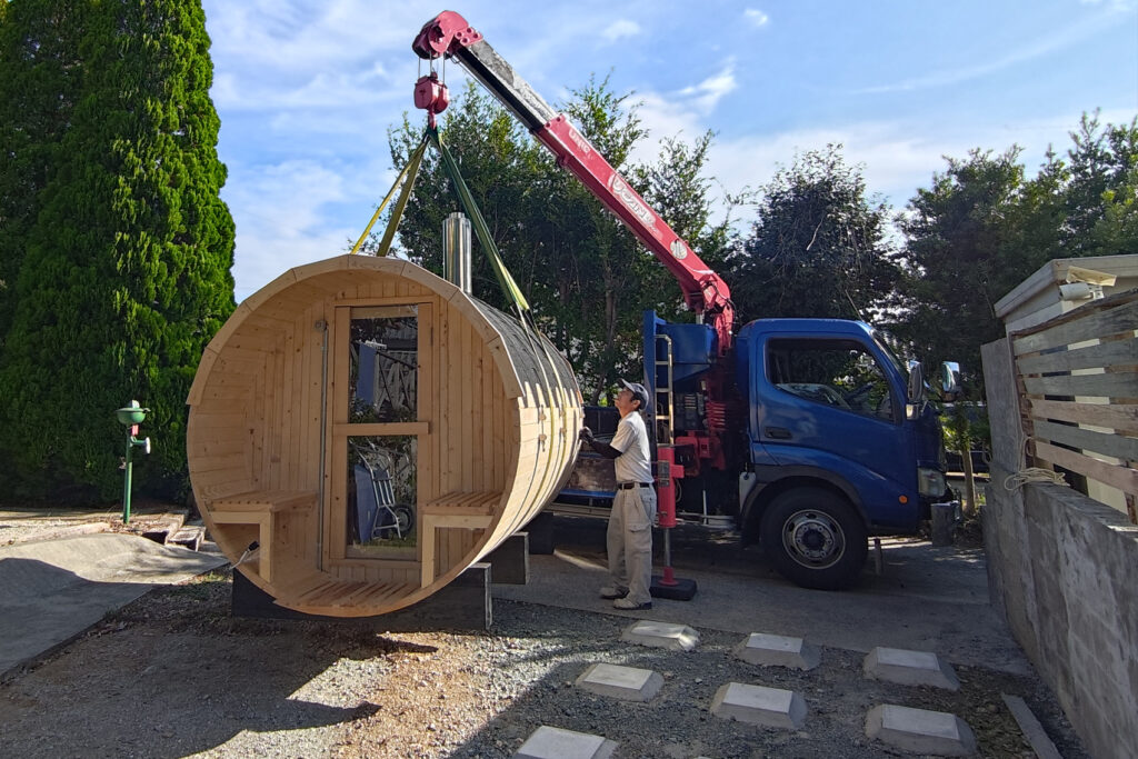 Fujimondのこだわりは「完成品」をお届けすること。工場で組立・塗装を済ませてから4tユニック車で伺うので、現地での組立作業は一切なし。わずか1日で設置が終わり、その日の夜には「自宅サウナ」を楽しめます。