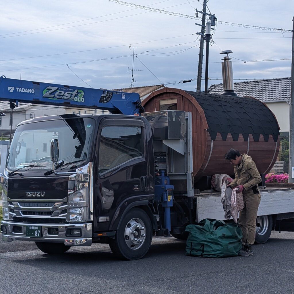 - 積み込み: 静岡県袋井市の工場で、丁寧に仕上げたサウナをユニック車へ。